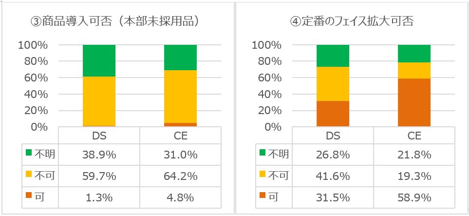 本部登録されているものの、当該店舗では定番外となっている商品の導入可否については、ディスカウントストア・家電量販店ともに「可」の割合が数%にとどまりました。この結果から、定番外商品の導入は業態を問わず実施のハードルが高いことが分かります。