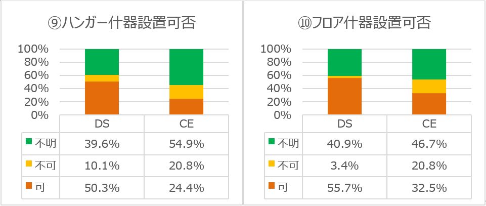 一方、パネル・トップボードは可否が拮抗しており、特に家電量販店では設置不可の割合も一定数存在するため、店舗選定が重要です。また、ハンガー什器・フロア什器については業態差が大きく、ディスカウントストアでは半数近くで展開可能であるのに対し、家電量販店では実施可能な店舗が限定的となりました。