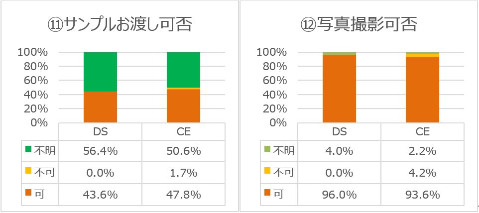 サンプルのお渡しについては、家電業界では商品の単価が高いこともあり、不明の割合が高い結果となりました。一方、写真撮影については、両業態とも「不可」とする店舗はごく少数であり、多くの店舗で撮影が可能な状況となっています。