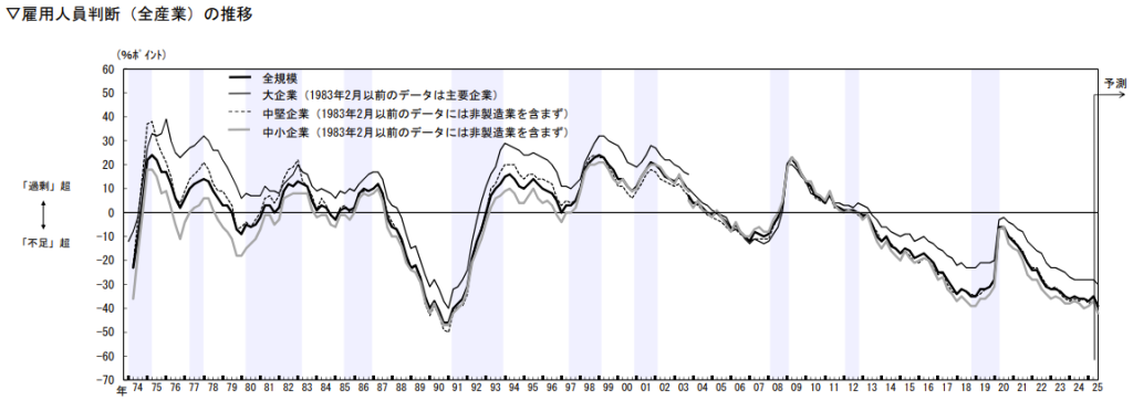 日本銀行が実施している短観調査においても同様の傾向が見られます。雇用人員判断D.I.の推移を見ると、全産業において人手不足感が悪化していることが確認できます。特に2020年以降は「不足」の状況が続いており、経済活動の回復と共に労働力の需要が供給を上回る状況が定着しています。